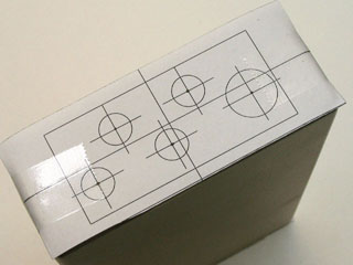 側面はこのように型紙を貼って、穴のセンターにキリなどでしるしを付けると加工が楽です。