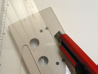 LCDの長窓は、窓の四隅に穴を開け、正面から穴の外周基準に窓のフチとなる部分にカッターなどで傷を入れます。