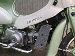 レッグシールドを外すと、エンジンがフロントフェンダーの後ろに隠れてしまうため冷却が悪く、何度もオーバーヒート気味になりました。 かといって、ノーマルのスタイルに戻すにはそれなりの覚悟がいるし、何と行っても新品レッグシールドは6000円もする(T-T)。 そこで、考えついたのが A.B.S.(Air Blade-cooling System)です(笑) 何て事はない、ただの整流板ですが、冷却効果は驚くほどあります。 レッグシールド無しの状態だと、上り坂でオーバーヒートしそうでやばかったのが、全然オーバーヒートしにくくなります。 空力の偉大さを思い知らされました。本当に。 レッグシールドほどは目立たないので、興味がある方はやってみてください 注意:ブレーキのロックを防ぐことは出来ません(爆) |