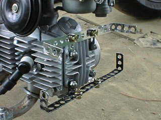 | 材料: ・曲げ板 30cm×2本 150円×2 15cm×1本 100円 ・家にあったPPの段プラ版(5mm?):タダ (買えば300円くらい?) ※サイズは写真を参考に (私は30×30cmで足りました) ・お好みのカッティングシート(表面に貼る) ・固定用ネジ M6×10mm 8本 道具: ・金ノコ ・はさみ ・カッター ・プライヤー ・10mmスパナ ・ドリル 作り方: ・左の写真を参考にステーを作ります 注意:エンジンのスタッドボルトの位置が、車体の中心からいくらか右にずれているので、若干左側を長めにしたほうがきれいに仕上がります。 ・ステーを写真のように止めます ・上の写真を参考にプラ板を切ります ・プラ板にステーに合わせて穴を開けたり、コックやプラグ穴部分の逃げを作る加工をしますます ・ネジで止めて完成。 ※ステーを曲げるとき、前側が10度くらい開き気味になるように角度を付けること。 |
