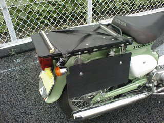 純正キャリアの上にボルトオンするキャリアです。 「クーラーバッグ流用サイドバッグ」を取り付けるフックも付けました。 これで、かなり積載量が増えます。 サイドバッグステーは汎用性を持たせてあるので、万が一バッグがダメになった場合でも、すぐにホームセンターでクーラーバッグを買って付けられます。 |