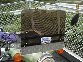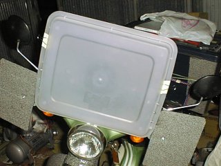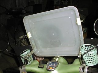 カブは、タンクバッグが置けなくて地図を入れる場所がないので、スクリーン兼マップスタンドを作ってみました。 ちょうどツーリングマップルが入る大きさです。 ライトの光がカゴに反射してまぶしいのを抑えてくれる効果もあって、一石三鳥?です。 ※写真には写っていませんが、B4のクリアーケースに入れたツーリングマップルをスクリーンの手前に置いて、上側をクリップで止めます。 |