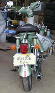 純正レッグシールドの上にフィルムを貼っただけです。 大理石調は模様の特性上、つぎはぎが目立たないので、実物をよく見るとかなりの部分がつぎはぎだらけになっています(笑) ベースは、リトル用の茶色レッグシールドです。 (ベース色の意味がないってツッコミは無しね。エンジン側が渋い色になるというメリットがありますので。) |