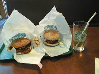 ハンバーガー「ラッキーバーガー」と「チャイニーズチキンバーガー」(右)です。