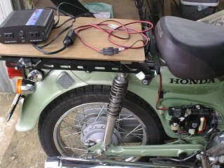 ![]() バッテリー回りの配線取付説明(写真はリトルカブ) 赤線は+ 青線は−の大まかな解説です ![]() 完成図 \(^o^)/ 荷台上の箱は、テストに使った車用のインバーターです。 |