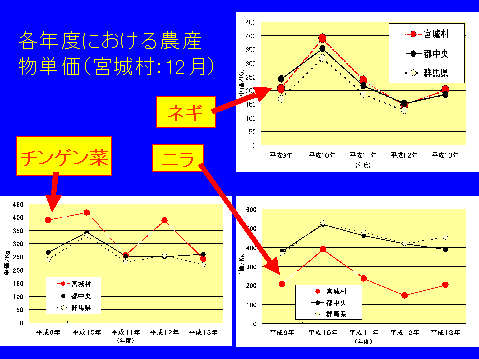 また、宮城村産の他の農作物も売れなくなったとしいう風評も多く耳にしたため、平成9年から13年までのBSEの影響が強かった12月の農産物単価を示しました。その結果、東京、群馬市況と比較して平成13年が特に宮城村産農作物が被害を被っているとしう事実は確認できませんでした(風評の元はニラを指していたらしいですが、宮城村産ニラはいずれの年度においても低値がみられ、BSE確認時の平成13年に特に安値は示していなかった)。