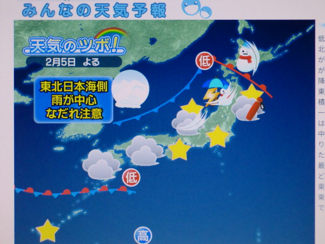 5日は、北海道から東北は日本海側を中心に所々で雨や雪でしょう。